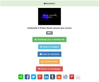Success! di layar, Anda dapat memilih untuk mengunduh file audio tersebut ke komputer, ke Dropbox, OneDrive, atau mengedit kembali dengan